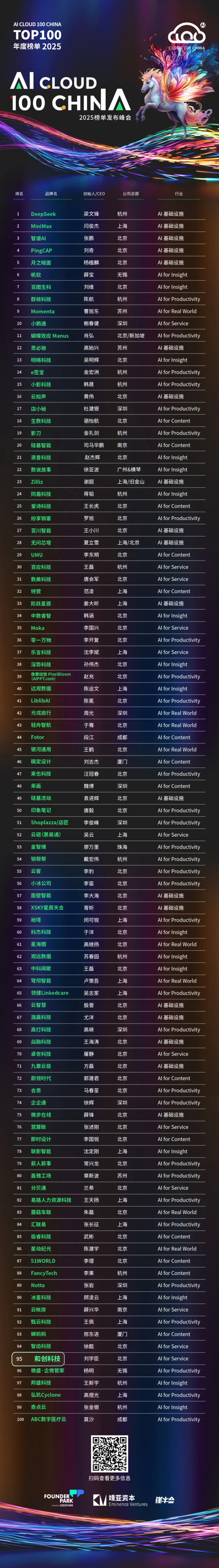 6月22日,中國人工智能與云計(jì)算領(lǐng)域的權(quán)威風(fēng)向標(biāo)《AI Cloud 100 China》2025年度榜單于北京 751 Park 正式發(fā)布,這是靖亞資本和Founder Park、崔牛會兩位聯(lián)合主辦方合作推出的第四屆榜單。和創(chuàng)(北京)科技股份有限公司(以下簡稱“和創(chuàng)科技”)憑借在“SaaS + AI”領(lǐng)域的持續(xù)創(chuàng)新與深度應(yīng)用,再次從數(shù)百家Cloud企業(yè)中脫穎而出,登上榜單。