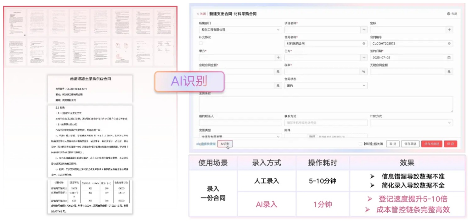 智能識(shí)別并錄入合約條款、付款比例、付款條件等關(guān)鍵信息,為成本控制提供更詳實(shí)依據(jù)。