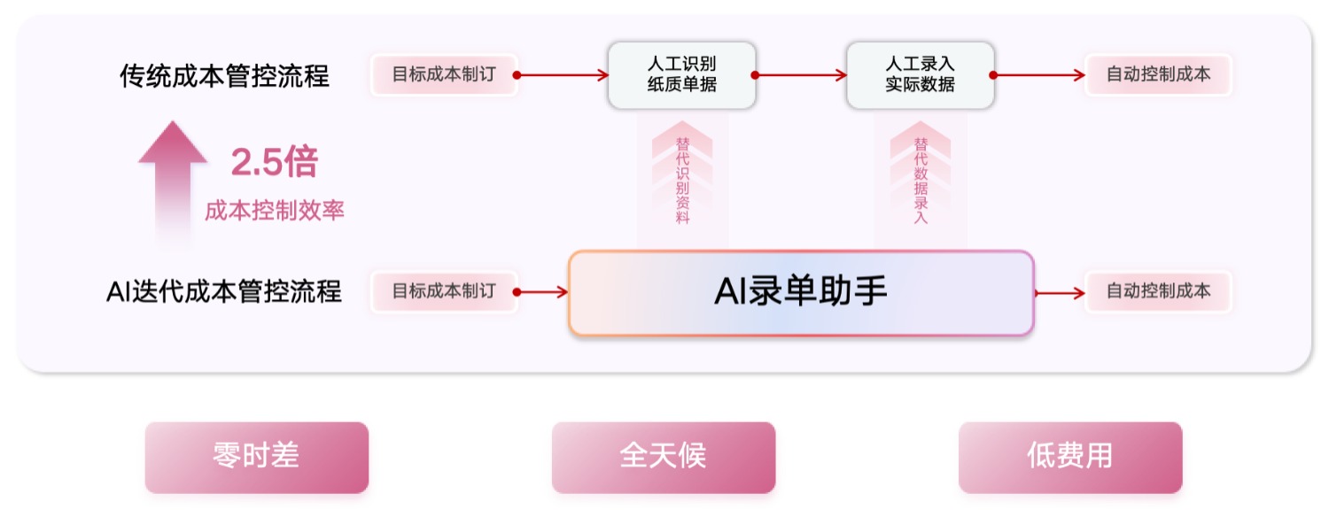 目標(biāo)成本制訂 → AI錄入助手(替代識(shí)別資料、替代數(shù)據(jù)錄入) → 自動(dòng)控制成本