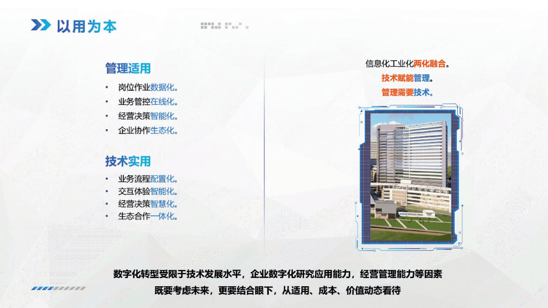數字化轉型需要以投入產出為考量,以切實幫助企業經營為目標,而不能為了數字化而數字化。在信息化與工業化“兩化融合”的趨勢下,技術賦能管理,管理需要技術,主要體現在提高工作效率,控制企業經營風險,提高管理能力,降低企業運營成本等方面。