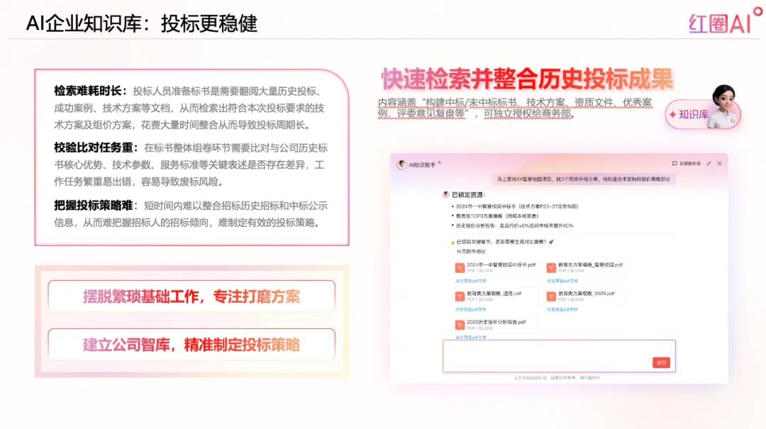 AI企業知識庫可秒級檢索并整合歷史標書、技術方案、評委意見等資料,形成智能化投標策略,減少人工檢索時間,提升投標成功率。