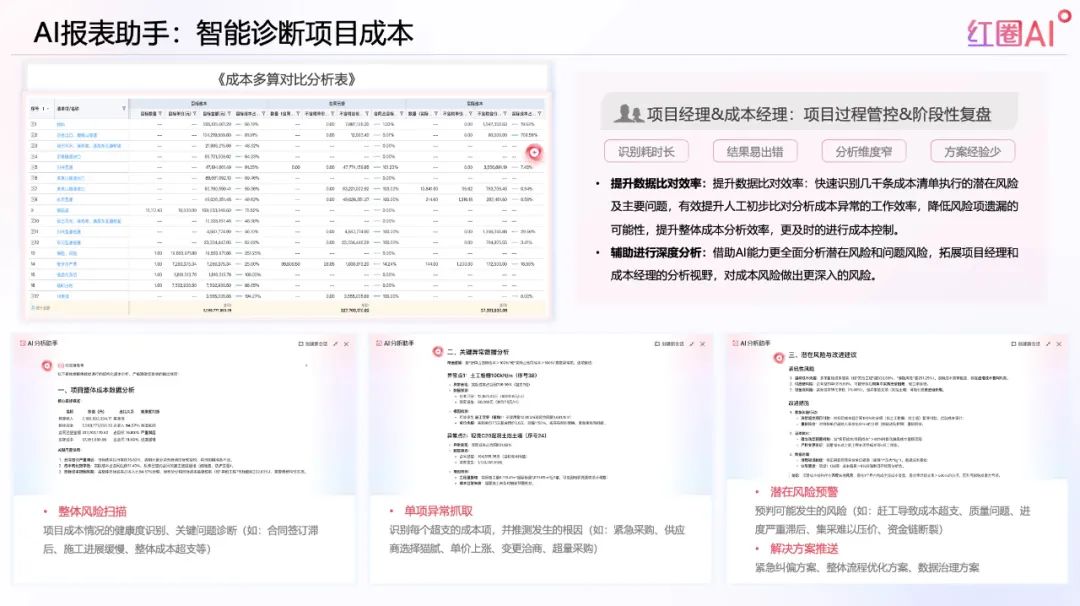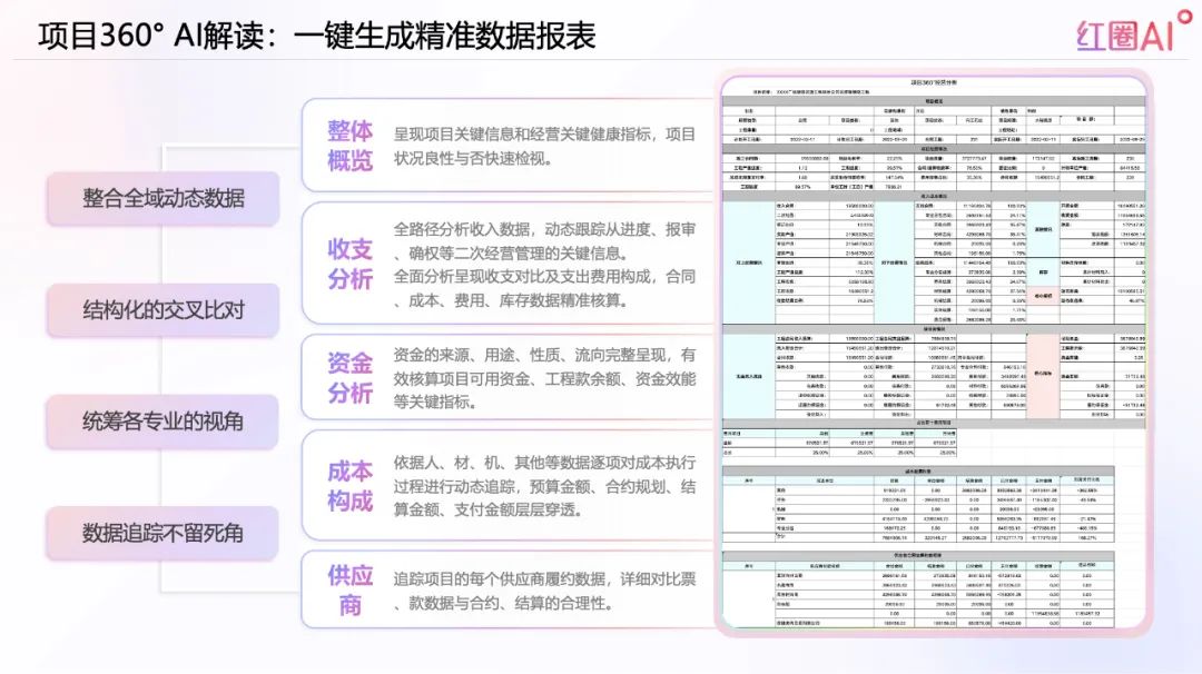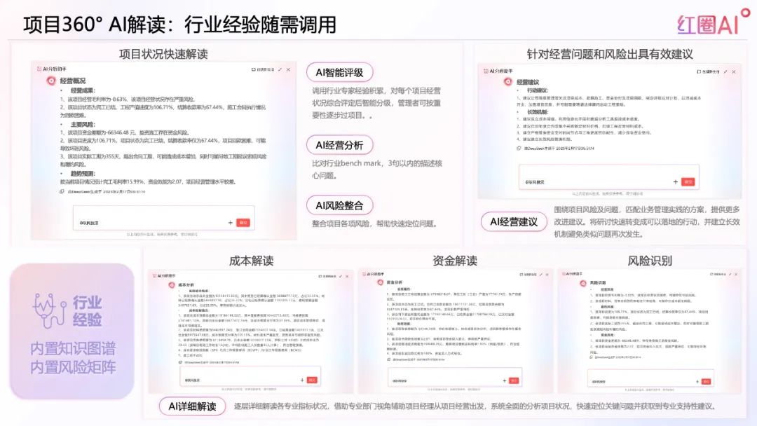 項目360°AI解讀功能可實時整合資金、成本、合同、付款等數據,自動生成可視化分析報告和風險預警,幫助企業更好地應對政府對“全過程留痕”的監管要求。