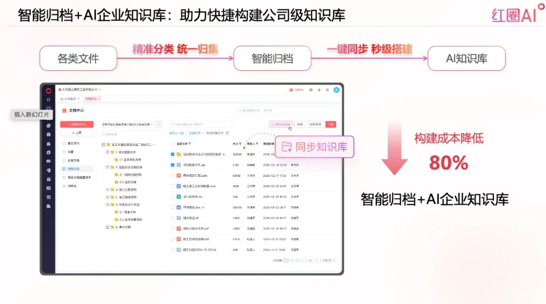 通過AI企業知識庫,企業內部的制度、流程、案例、技術資料可以形成數據資產,為后續項目和管理提供智能化支持。