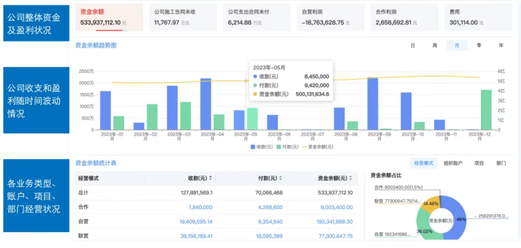“管資本”的第一步,是得看清資本花在哪、賺在哪。紅圈先給所有項目建了一套“統(tǒng)一數(shù)據(jù)標(biāo)準(zhǔn)”——不管是項目現(xiàn)場的施工日志、材料采購單,還是分公司的資金流水、合同臺賬,所有數(shù)據(jù)都從“源頭”在線生成,實時同步到集團(tuán)云端,中間沒有任何人工“加工”環(huán)節(jié)。這意味著什么?你在總部辦公室,打開系統(tǒng)就能像“做CT”一樣,直接“穿透”到任何一個項目的任何一張單據(jù):想查某項目的鋼筋采購成本,能看到每一筆采購的供應(yīng)商、單價、付款時間;想知道某項目的資金余額,能實時看到賬戶流水,連一筆小額報銷都不會漏;想盯進(jìn)度,能看到現(xiàn)場每天上傳的施工照片、進(jìn)度填報,是不是真的“達(dá)標(biāo)”,一眼就懂。數(shù)據(jù)不再是“二手貨”,資本效益的真實情況,清清楚楚、明明白白。總部既能看全局——所有項目的整體盈利、資金總盤子,也能抓細(xì)節(jié)——單個項目的成本超支、資金滯后,“管資本”終于有了精準(zhǔn)的“依據(jù)”。