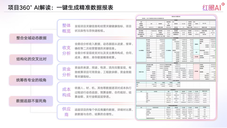 比如項目360°AI解讀,你想了解某個項目的情況,不用再讓下屬寫報告——點一下按鈕,系統(tǒng)自動生成一份“效益體檢報告”:資金夠不夠用?成本有沒有超支?進(jìn)度是不是滯后?甚至能告訴你“成本超支是因為某分包商頻繁變更合同”,連優(yōu)化建議都給出來。相當(dāng)于給你配了個“智能參謀”,不用自己扒數(shù)據(jù),問題根因、解決方向全清楚。